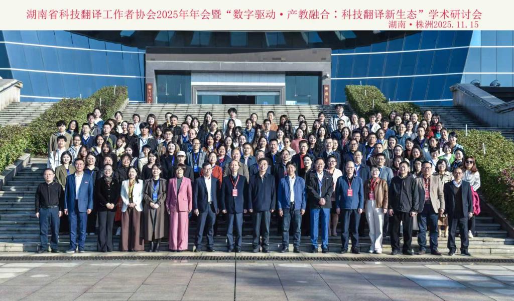 2025年11月14日至16日,由湖南省科技翻译工作者协会主办、湖南工业大学承办的湖南省科技翻译工作者协会2025年学术年会暨“数智驱动·产教融合:科技翻译新生态”学术研讨会在湖南工业大学举办。全省科技翻译工作者代表和部分研究生共近200人参加了大会。我院湖湘典籍英译与传播研究基地胡芳毅教授、满丹南老师参加了本次会议。
