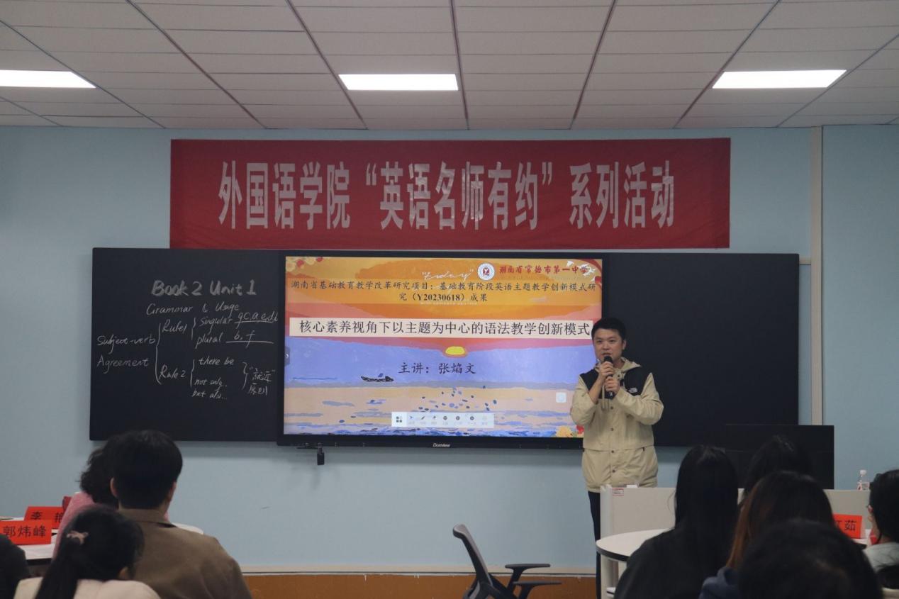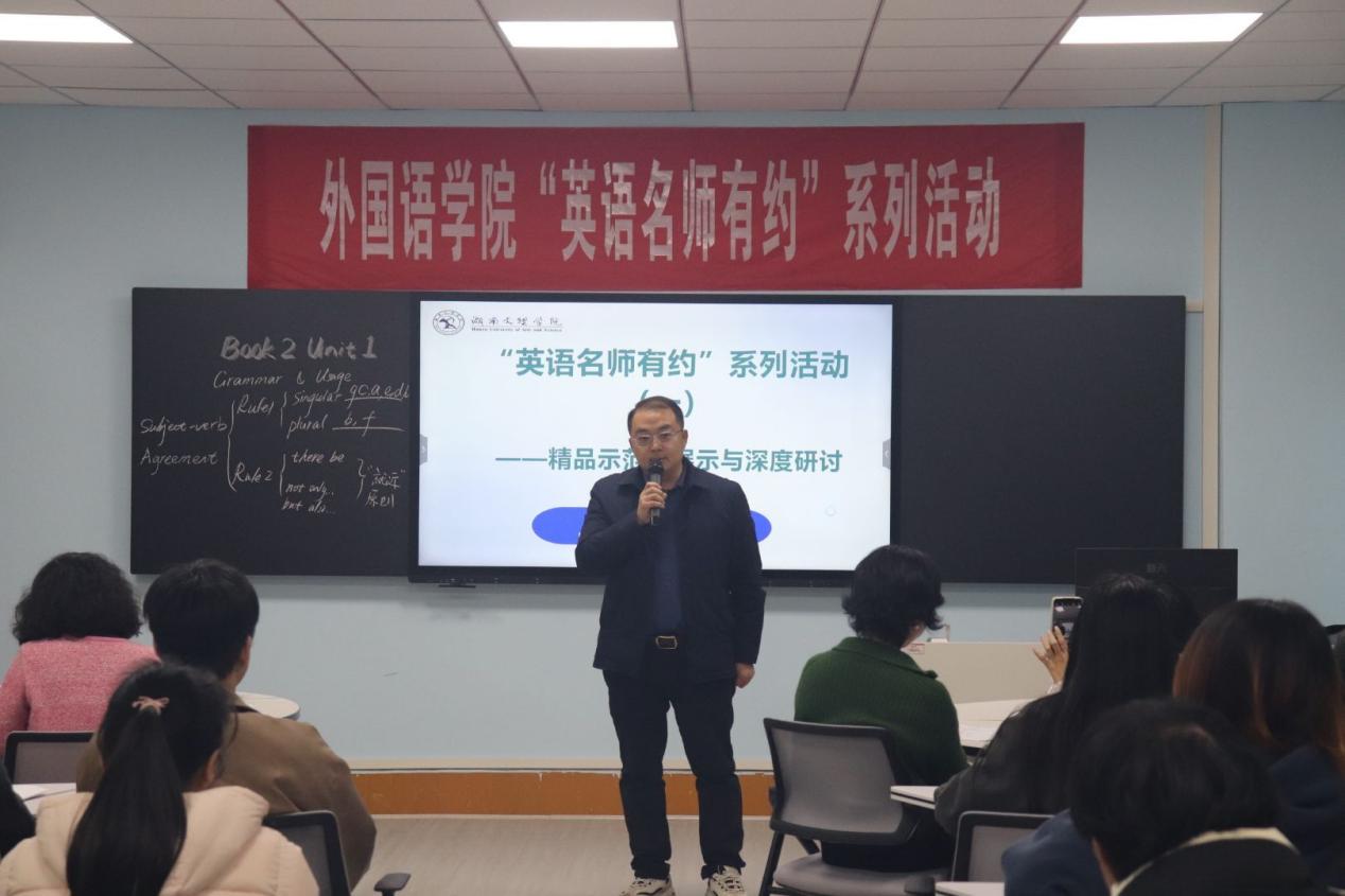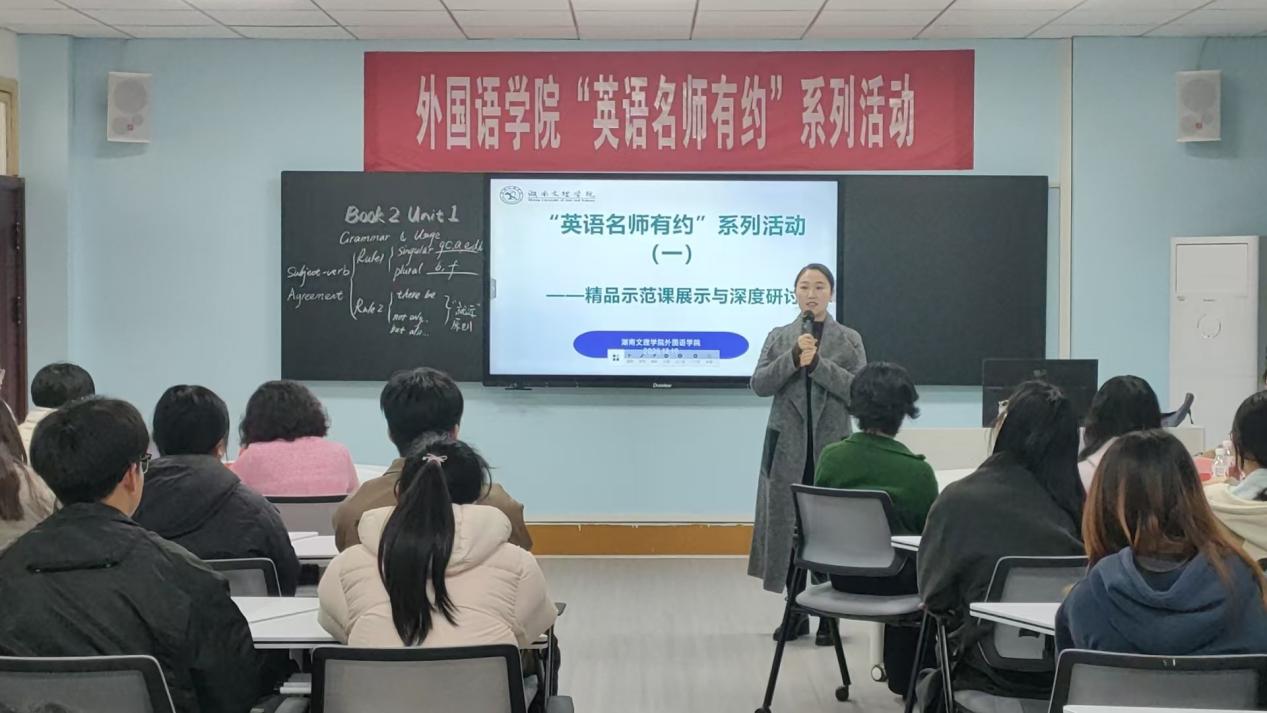 为深化高校师范英语教育与中学英语教学的协同发展,推动师范专业内涵建设与教师教学能力提升,1219日下午,外国语学院在虚拟仿真实验室T2-B501成功举办“英语名师有约”系列活动的首期工作坊。本次活动由外国语学院英语系主任李艳老师主持,以“聚焦语法课堂,共研教学实效”为主题,特邀常德市第一中学英语教学团队开展精品示范课展示与深度教学研讨。常德市一中副校长曾凡稳、名师卢嘉彬、教学能手张焰文、主讲教师孔秋云等一线教学专家,外国语学院英语专业教研室教师代表及2022级、2023级英语师范专业学生代表共同参与活动。