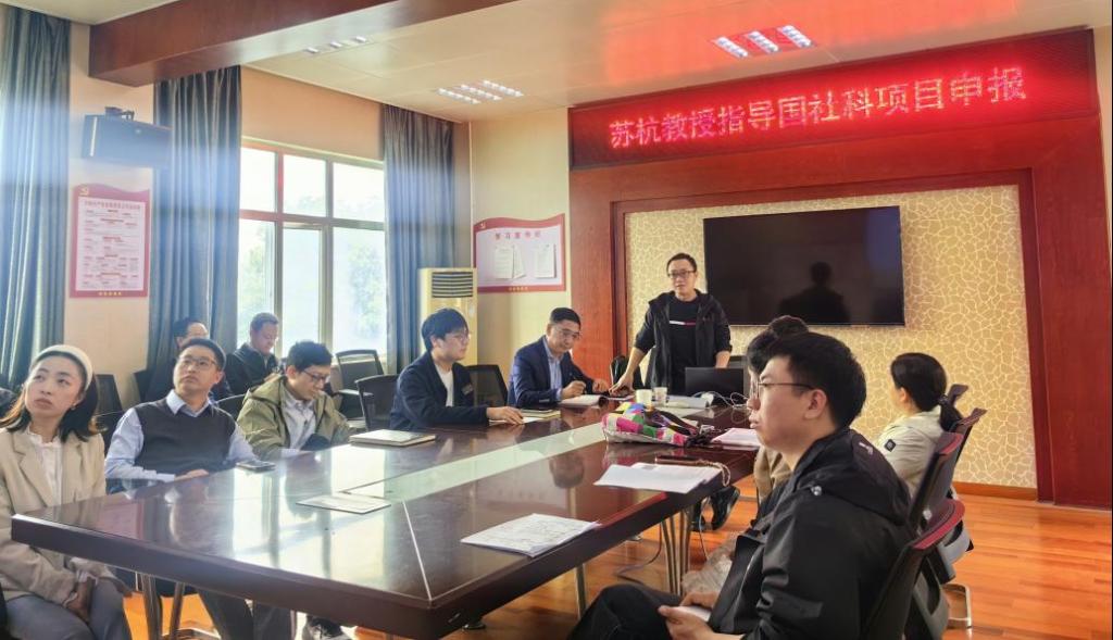 本次活动分为集中指导和一对一指导两个环节。在集中指导阶段,苏杭教授结合自身丰富的科研经历,围绕国家社科基金项目的申报要点、选题策略、论证技巧及常见问题进行了系统分享。他深入剖析了高质量申报书的撰写逻辑,强调问题导向和创新性的重要性,并鼓励教师们立足自身研究基础,聚焦前沿,凝练特色。随后,苏杭教授对学院教师的国社科申报书进行了一对一精细化指导。他认真审阅每份材料,从选题定位、框架设计、研究内容到语言表达,逐一提出针对性修改建议,耐心解答教师们在申报过程中遇到的实际困惑。
