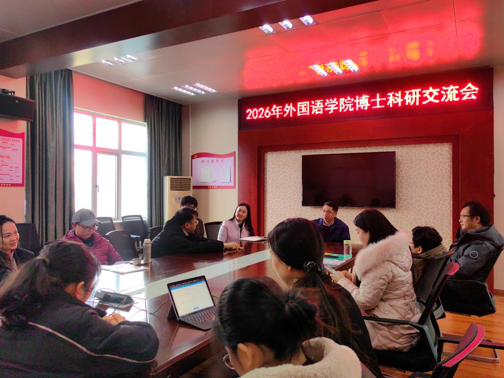 2026年1月8日下午4:00,外国语学院在三楼小会议室召开博士科研交流会。学院院长刘锋教授、副院长范丽娜教授及全体博士参加会议。会议由分管科研工作的副院长范丽娜主持,院长刘锋作总结讲话。