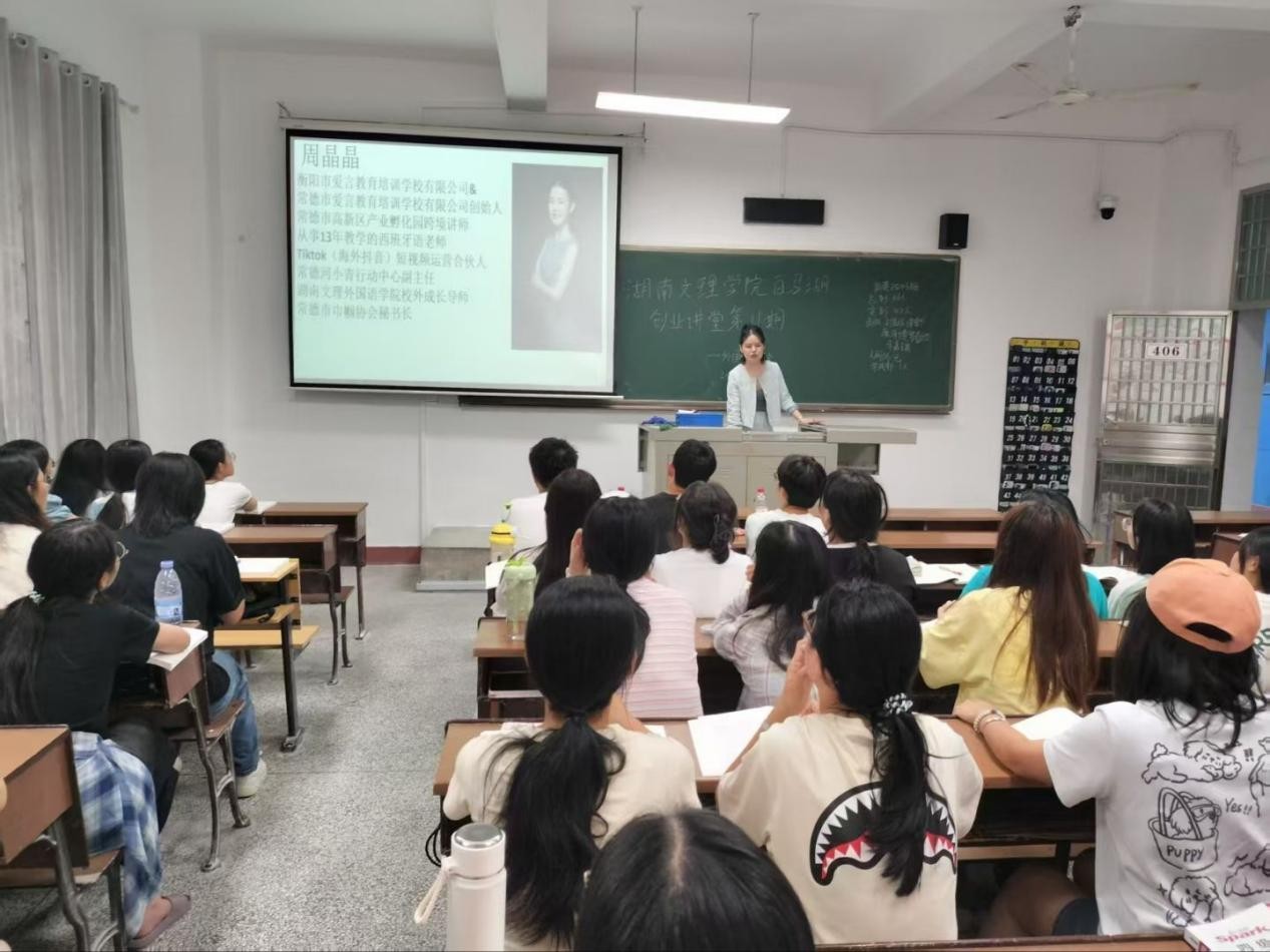 讲座中,周晶晶老师结合就业与创业市场趋势,指出小语种是竞争力“加分项”,并以法语、韩语、西班牙语为例,阐述其在跨境电商、国际文旅等多个领域的就业优势,助力同学们开辟差异化发展赛道;同时她聚焦小语种创业方向,分享了小语种培训、跨境文化咨询等实操路径,并结合爱言教育经历从市场定位、课程设计等方面给出具体建议,鼓励学生结合小语种优势与市场需求打造特色项目。