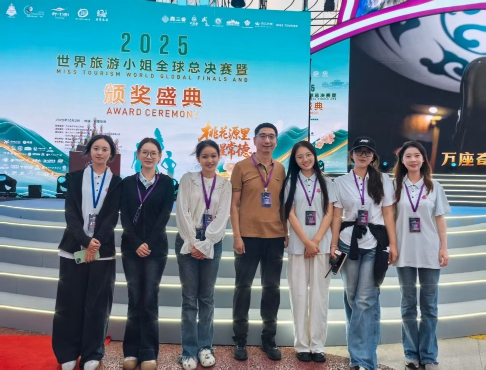 9月18日至10月2日,备受瞩目的2025年世界旅游小姐全球总决赛在常德隆重举行。外国语学院应组委会邀请,选派了来自英语专业的蔡芊、谷潇鸿、刘雨涵、刘佳欣、吕佳欣、向思蕊六名优秀学子,全程参与赛事的翻译、接待、陪同服务及赛务组赛事服务工作。他们凭借扎实的语言能力、跨文化沟通技巧和饱满的服务热情,赢得了主办方、各国参赛佳丽及与会嘉宾的高度赞誉。
